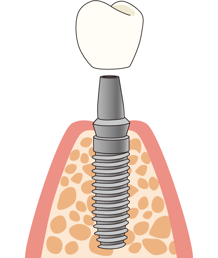 歯を失った時に、その部分を補うための治療法の一つです。 抜けたところにインプラント(人工歯根)を埋め込み、人工の歯をその上に取り付けます。 患者様に合わせて1本ずつ作るので、噛み心地も見た目も、天然の歯をほとんど変わりません。
